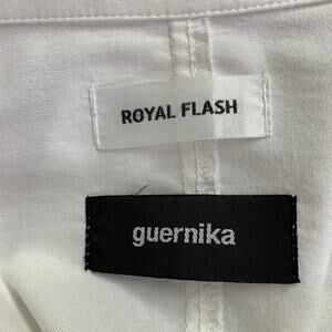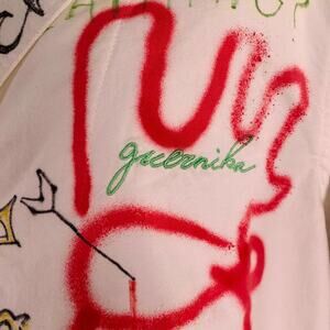 GUERNIKA by ROYAL FLASH coat in a white cotton woven fabric featuring a multi-color hand drawn graphic design, two pockets, and button closure. Made in Japan.