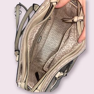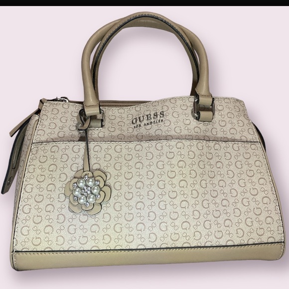 Cute Guess bag. 4 compartments, 1 mini bag inside with zipper and other two mini bags looks like cardholders. The other 2 other compartments are in the outside (see pictures) it has the keychain with cute glitters. It also has 1 more belt so you can use it as crossbody.