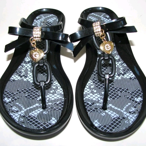 GUESS BLACK BOW TIE,CHAIN SANDALS,GOLD HEART+CRYSTAL CHARM,SHOES,FLIP FLOP