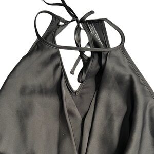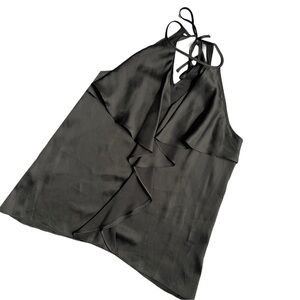 Black silk/satin tank top from Guess in a size xs. This blouse is lightweight, flowy and full length. The blouse has ruffle detailing, a v neck and a halter top that ties for the perfect fit. This blouse is in excellent preloved condition with no flaws.