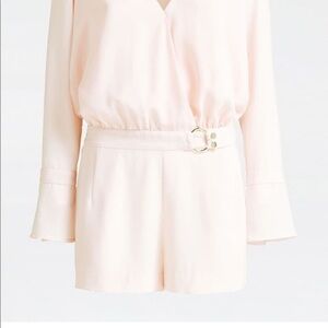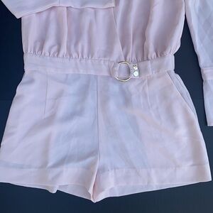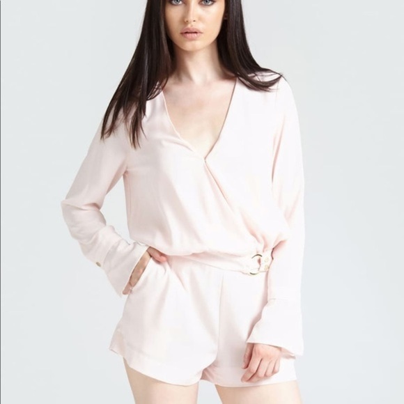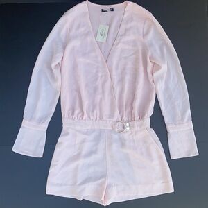 Blush pink color Fluid fabric jumpsuit. V-neck. Regular fit. Long sleeves. Belt fastening.