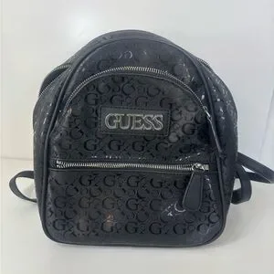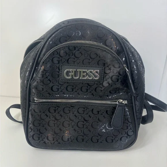 Black backpack with GUESS logo. Features a stylish pattern and front zipper pocket. Ideal for daily use.