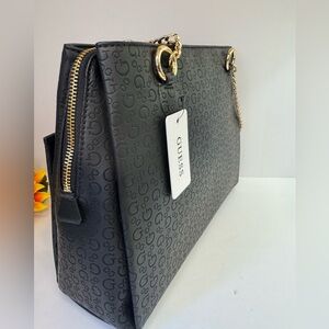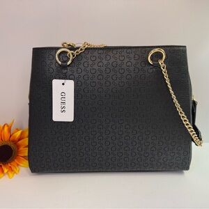 Stylish GUESS shoulder bag in black. Features gold chain accents and logo details.