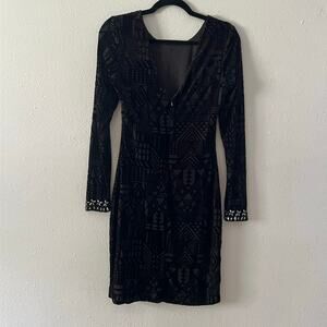 Stunning and sophisticated, this GUESS Los Angeles bodycon dress is the perfect statement piece for your next evening out or holiday event. Made from a soft velvet fabric with a semi-sheer geometric pattern overlay, this fitted dress features long sleeves with dazzling rhinestone embellishments on the cuffs. The back features a deep V with a hidden zip closure for a flattering silhouette.