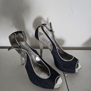 Chic denim jean peep-toe heels with silver accents. Stylish and versatile for any event.