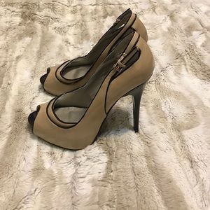 Very comfortable Black and Tan peep toe pumps, pre loved have minor scuffs on side of shoe pictured in photo above, still have a lot of wear left in them!