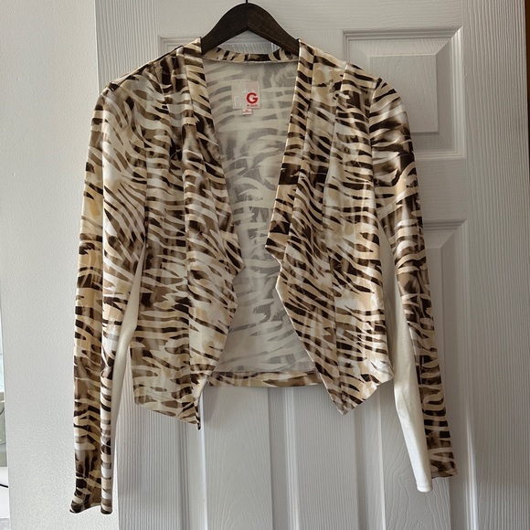 Stylish open front cardigan with an animal print design. Features shades of brown, cream, and black.