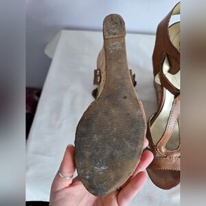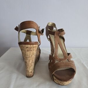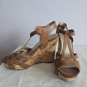 Fun strappy wedges perfect for summer wear. Okay condition with obvisigns of wear. Split front stap on both shoes that does not affect function. No obvious scratches to body of shoe or cork.