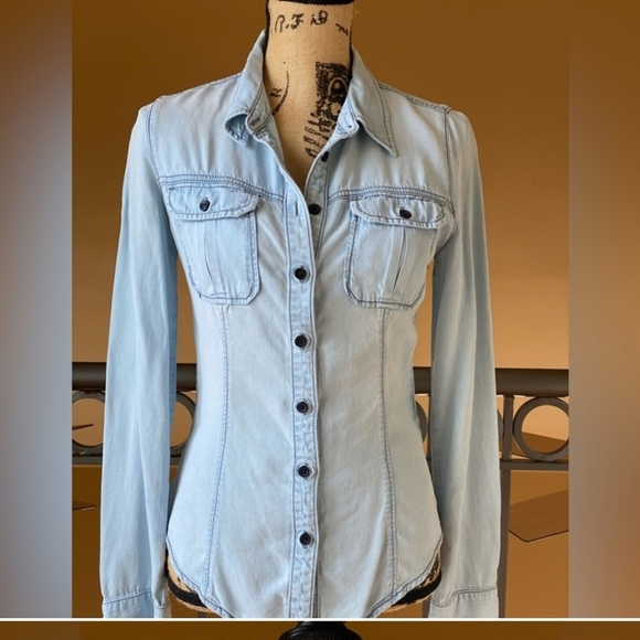 GUESS COLLAR shirt Tencel button Up Shirt light blue denim western look