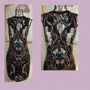 GUESS "CUTAWAY NECK" BLACK FLORAL PRINTED LACE COVERED DRESS~SLEEVELESS~SIZE 4