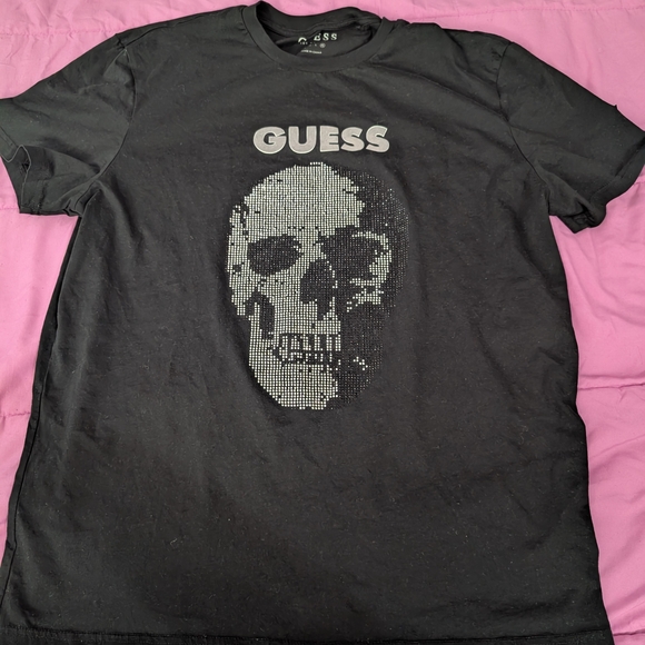 Stylish GUESS tee with a bold skull design. Perfect for casual wear. Black and silver rhinestones.