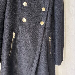 Stylish black coat with gold buttons. Double-breasted design. Features zippered pockets and satin lining.