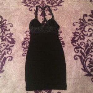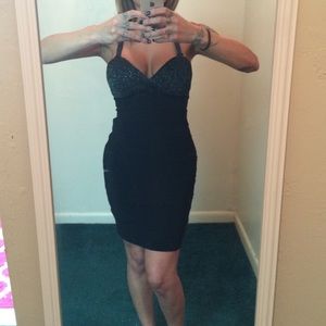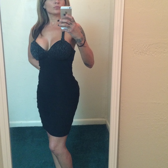 I have only worn this dress a few times. Form fitting micro dress. Soft material with ruffles on the black part of dress. Very comfortable.