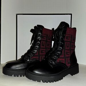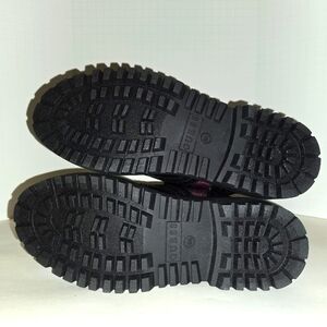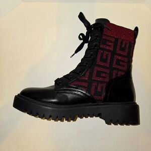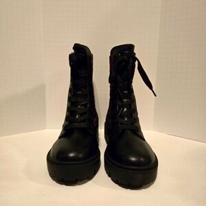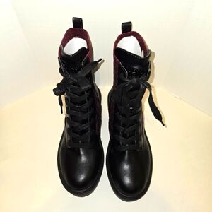 Black combat boots with dark red metallic detailing on the sides. The areas with detailing are made of a stretchier fabric-like material.