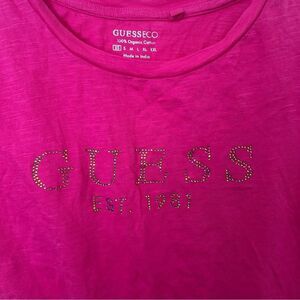 Bold fuchsia tee with sparkling Guess logo. Soft and stylish.