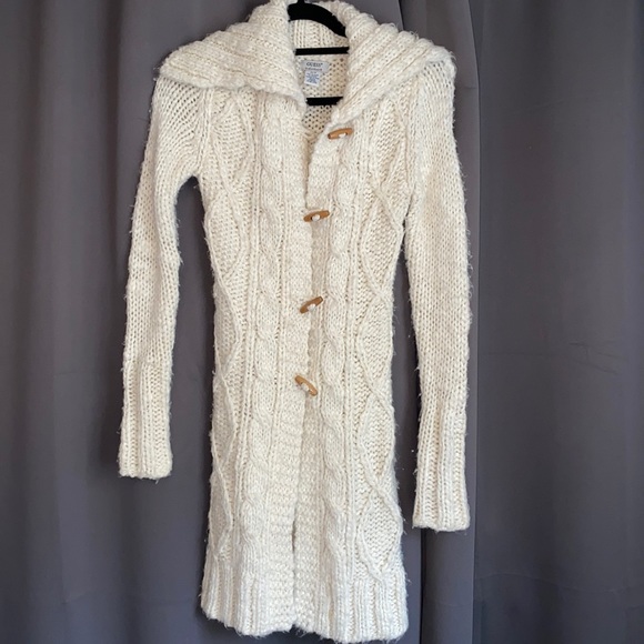 Oldie but goodie crochet long coat with 4 intact wooden buttons. Extra long sleeves and thick collar