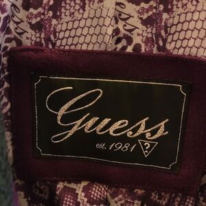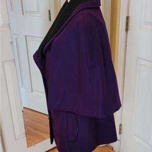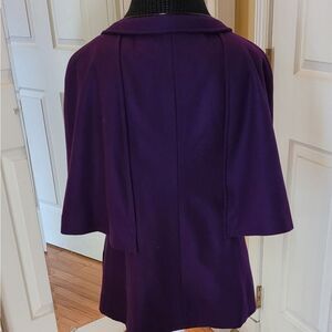 This coat features shoulder epaulets and comes with a matching belt. It is brand new and is a Size Large. The pockets and shawl collar are trimmed in licorice colored patent leather. Stylish and whimsical!