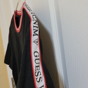 Sleek black tee by GUESS. Features striking red/white "GUESS DENIM" trim on shoulders.