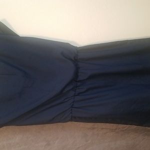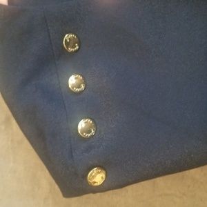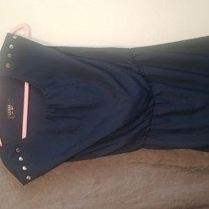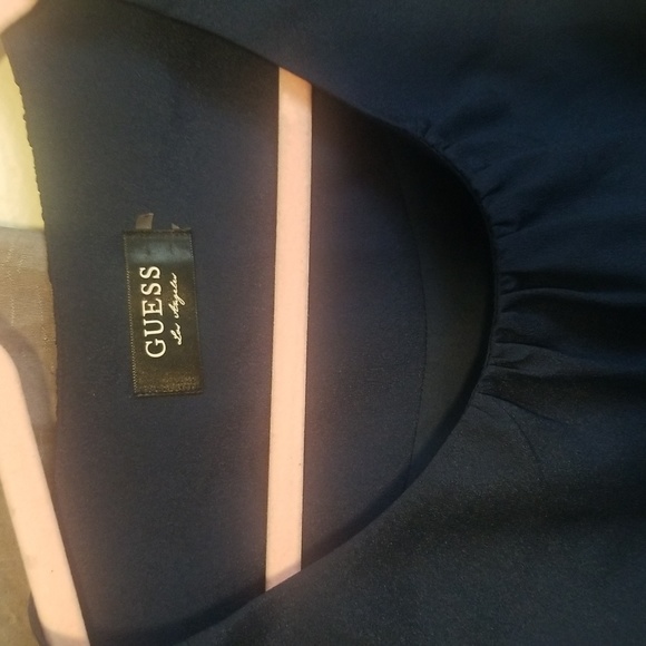 This dress is made by GUESS size 6 and navy blue. gold buttons along shoulder scrunched in the middle but no tie.