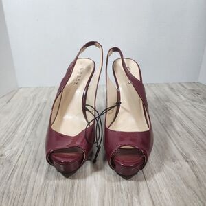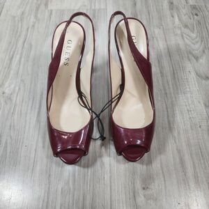 The product is a pair of sexy and stylish GUESS dark red peep toe pumps heels in size 8.5. These 90s-inspired heels have a 5-inch ultra-high stiletto heel, perfect for a party or cocktail occasion. Made for women, these synthetic insole heels are designed for the fashion-forward woman who loves to make a statement. The pump style and red color make them a bold choice for the summer, fall, or spring seasons.