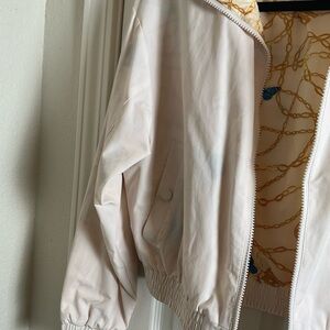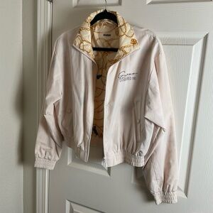 This Guess bomber jacket in a chic cream color offers a sporty yet stylish look with its zip-up front and designed-lining inside jacket ribbed cuffs and waistband for a comfortable fit. NWOT
