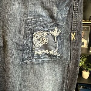 Super unique and cool distressed details with over threading, embellishments and distressed style stitching.