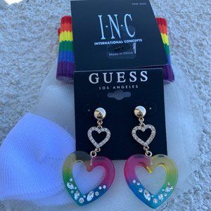 GUESS Double Heart Drop Earrings in Gold and Rainbow& Rainbow Socks Set/ FREE GIFT WITH PURCHASE/BEST OFFER EXCEPTED