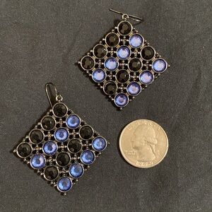 GUESS Brand Black & Blue Rhinestone, Grey Tone Big Square Shape Dangle, Pierced Hook Earrings