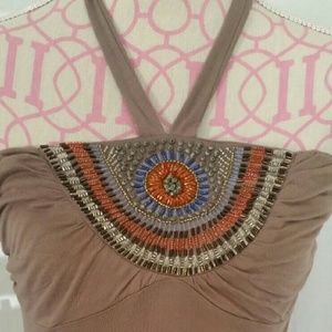 Guess brown runched top. Beaded embroidery across chest. EUC. NO FLAWS