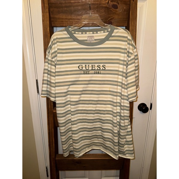 GUESS EST 1981 Striped T Shirt Mens XL Green White Tan Short Sleeve Tee