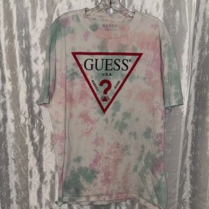 Keywords: Guess Jeans, logo tee, striped shirt, casual wear, graphic tee, vintage style, streetwear, bold stripes, short sleeve, mens fashion, summer style, everyday basic