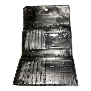 Elegant black wallet with embossed design. Features a sleek metal accent. Ideal for daily essentials.