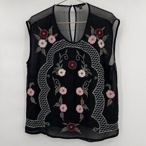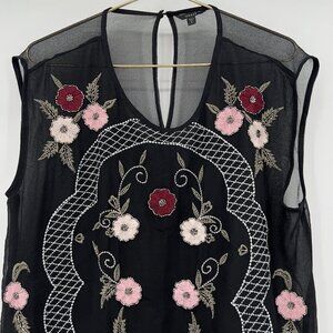 GUESS Embroidered /Embellished Sheer Black/Floral Sleeveless Top Women's XL