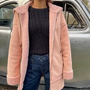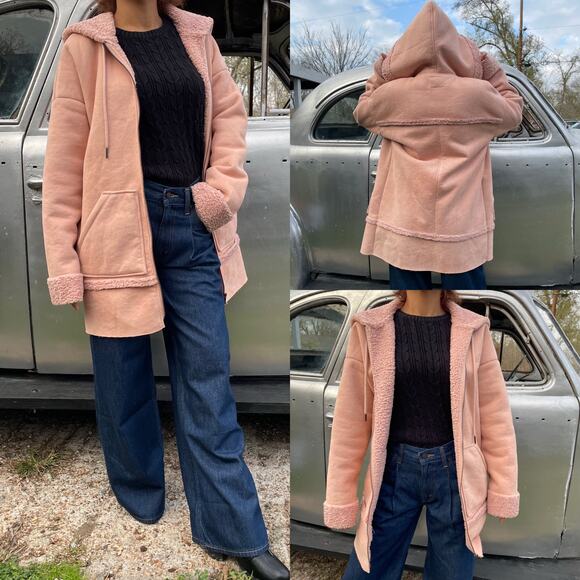 🔥GUESS Faux Shearling suede fur Coat Jacketin Cameo Rose Pink Minimalist Rugged Outdoor