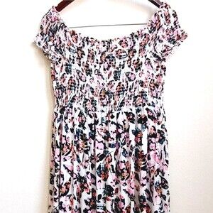 GUESS Floral On/ Off shoulder Maxi Dress Pink M Front Slit Smocked Walk-…