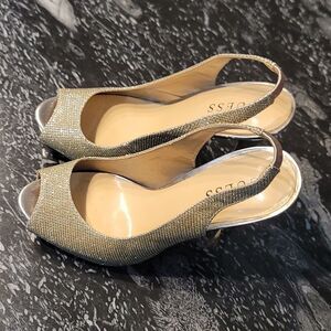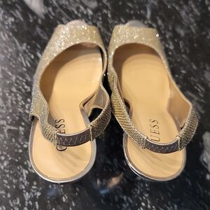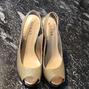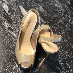GUESS GLITTER HIGH HEEL STILETTOS PEEP TOE SANDAL SIZE 7M COLOR GLITTER GOLD ALL MAN-MADE MATERIALS LINING BALANCE MAN MADE CUSHIONED FOOTBED INSOLE HEEL HEIGHT MEASUREMENTS APPROX 4"INCHES THIS ITEMS IS PRE-OWNED EXCELLENT CONDITION WITH ONLY LIGHT SIGNS OF WEAR IF ANY CHECK THE PICTURES ARE THE PICTURES