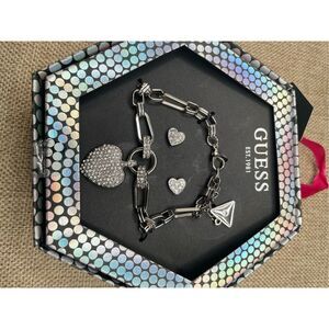 GUESS Gift Set Silver Tone Crystal Heart Bracelet & Earrings Set New Heart Theme