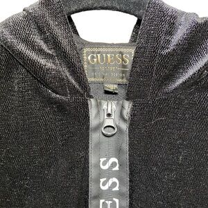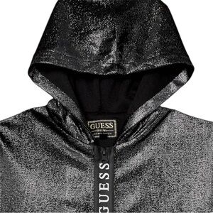 GUESS Girls Shiny Velour Logo Zip Front Hooded Bomber Y2K Pockets Long Sleeve