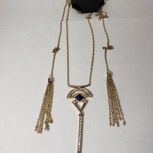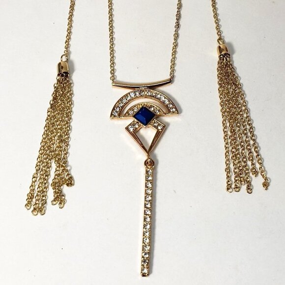 necklace, gold tone, layered necklace, fringed design, blue stone pendant, sparkling crystal, adjustable length, fashion accessory