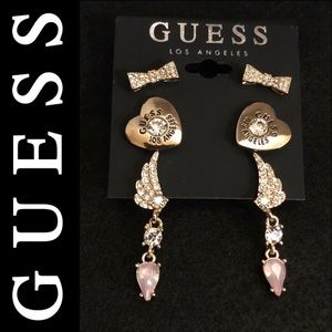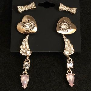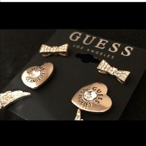 Brand New Never Worn Gold Tone GUESS Earrings. One Pair Gold Tone Bows With Clear Crystal Accents. One Pair Gold Tone GUESS Logo Heart Studs With Clear Crystals and One Pair Gold Tone Angel Wing with Clear Crystals and Frosty Pink Stones. Pictures Don’t do these Justice. Due to Lighting it’s very Hard to Capture the Detail In The Pictures. These are Beautiful.... Considering Reasonable Offers