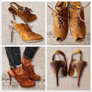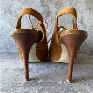 Holy chic! Guess By Marciano “Gwnitty” caramel suede lace up peep toe pumps purchased from Nordstrom. Suede leather upper with man made soles. Elastic on Slingback + adjustable front lacing. Size 8M.