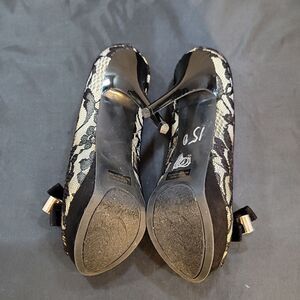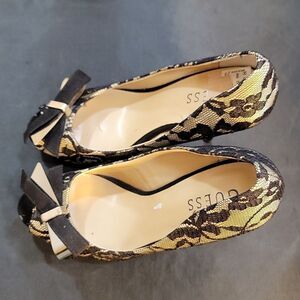 GUESS HIGH HEEL STILETTO PEEP TOE WOMEN"S PUMP SIZE 7M COLOR BLACK &TAN UNDERNEATH MADE WITH TEXTILE UPPER SYNTHETIC MAN-MADE MATERIAL HEEL HEIGHT MEASUREMENTS APPROX 4"INCHED THIS ITEMS IS PRE-OWNED EXCELLENT CONDITION WITH ONLY LIGHT SIGNS OF WEAR IF ANY CHECK THE PICTURES