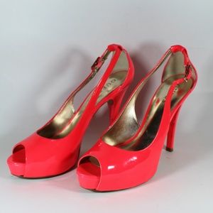 GUESS HONDO PEEP TOE NEON ORANGE HEELS PUMPS 8.5
