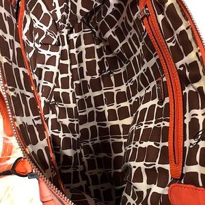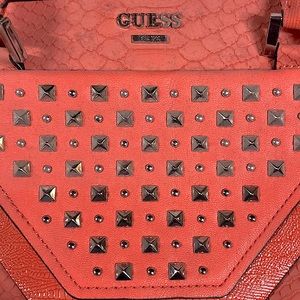 Perfect condition/Never used, beautiful coral color, studded detailing, faux snake skin print, white/brown pattern design on the inside, front flap pocket, zipper pocket inside as well as open pockets, silver zipper closure