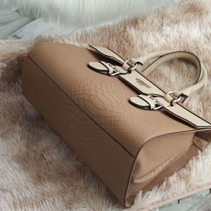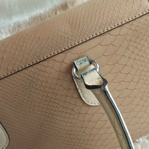 Beautiful two tone Satchel with silver tone hardware. Clean excellent condition. A few spots on back handle as shown in photo, otherwise no flaws.