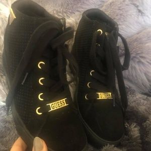 GUESS Women's Wedge Hidden-Wedge High-Top Sneakers size: 7 Condition is "Pre-owned" (worn once for a party, in great like-new condition! These are so sporty, classy, edgy and fun and the velvety fabric of them just adds to their expensive look. These look super cute with skinny jeans, leggings, shorts or that body-con mini dress in your closet! Shipped with USPS Priority Mail. Merry Christmas!