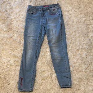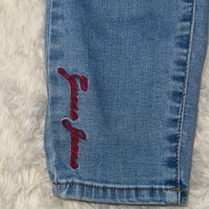 Chic high-rise jeans by GUESS. Light blue hue with stylish embroidery. Perfect for casual wear.