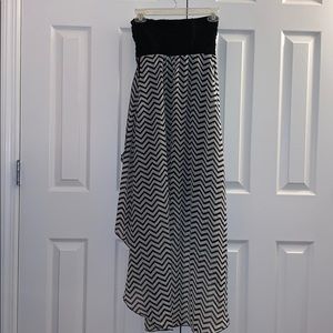 Strapless high-low with side zipper and clasp. 60% Polyester 35% Rayon 5% Spandex