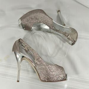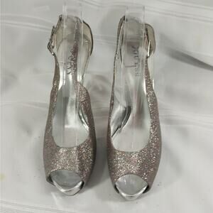 From Guess are these show-stopping rainbow silver/aurora borealis heels, with mirror silver heels and an ankle strap to a closed 4.75" heel! Ethereally beautiful! Size 8.5M, worn once! Excellent! *ACondition note: the insid lining is dry and has some crackling in it- no peeling at all- plz see pix! Thus the super low price! Otherwise: Superb EUC Condition! **ABSOLUTELY GUARANTEED CONDITION: EUC MINTY-EXCELLENT TO LIKE-NEW, by Lily @HauteClub!***