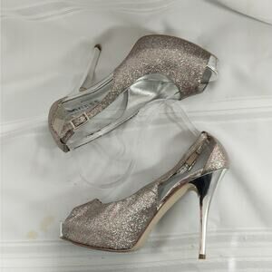 GUESS! IRIDESCENT RAINBOW SILVER, SILVER MIRROR HEEL, PEEP TOE HEELS! SZ 8.5M